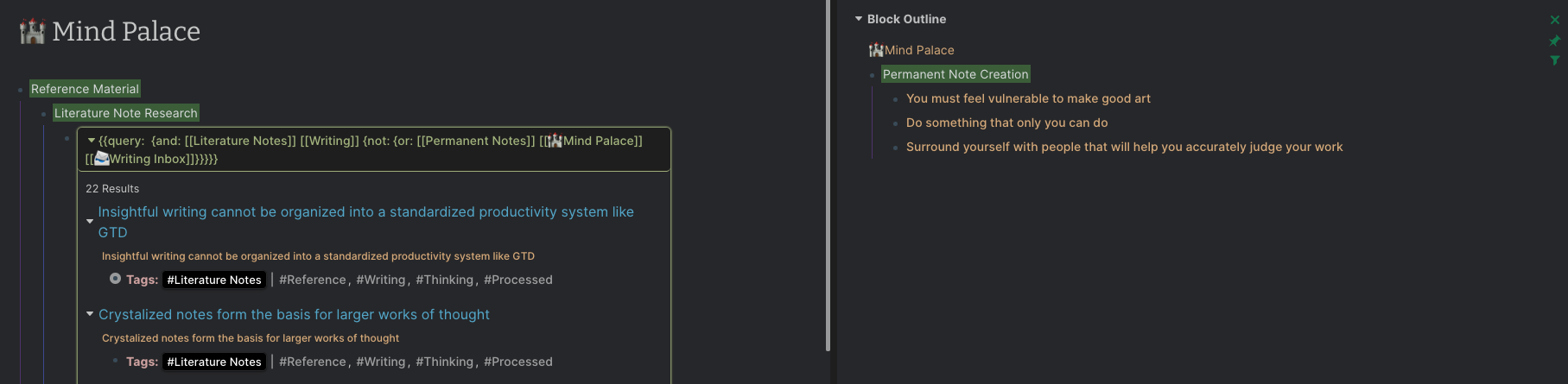 Once I have an idea of the tag that I want to pull from, I run a Roam Research query to surface those literature notes relevant to the tag. I do this by having a space open in the main area and in the right sidebar. In my case, I have created a page called "🏰 Mind Palace" that I use for this purpose. I open it in the main area, focusing on a block called "Permanent Note Creation" in the right sidebar.