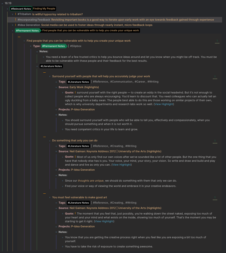 #[[Relevant Notes}} <index point in your slipbox>. The index point is the page reference form of the hashtag you used when creating the permanent note slip-box entry. - Indented under "Relevant Notes" are each of the relevant permanent notes that you want to connect to this permanent note. Think about conversations and connections that you may want to make with your future self. In this case, I will use the note next to "Idea Generation," "Incorporating Feedback," and "Tribalism." I'll create block references to these permanent notes in the slip-box by alt-dragging them to a block indented under "Relevant Notes."