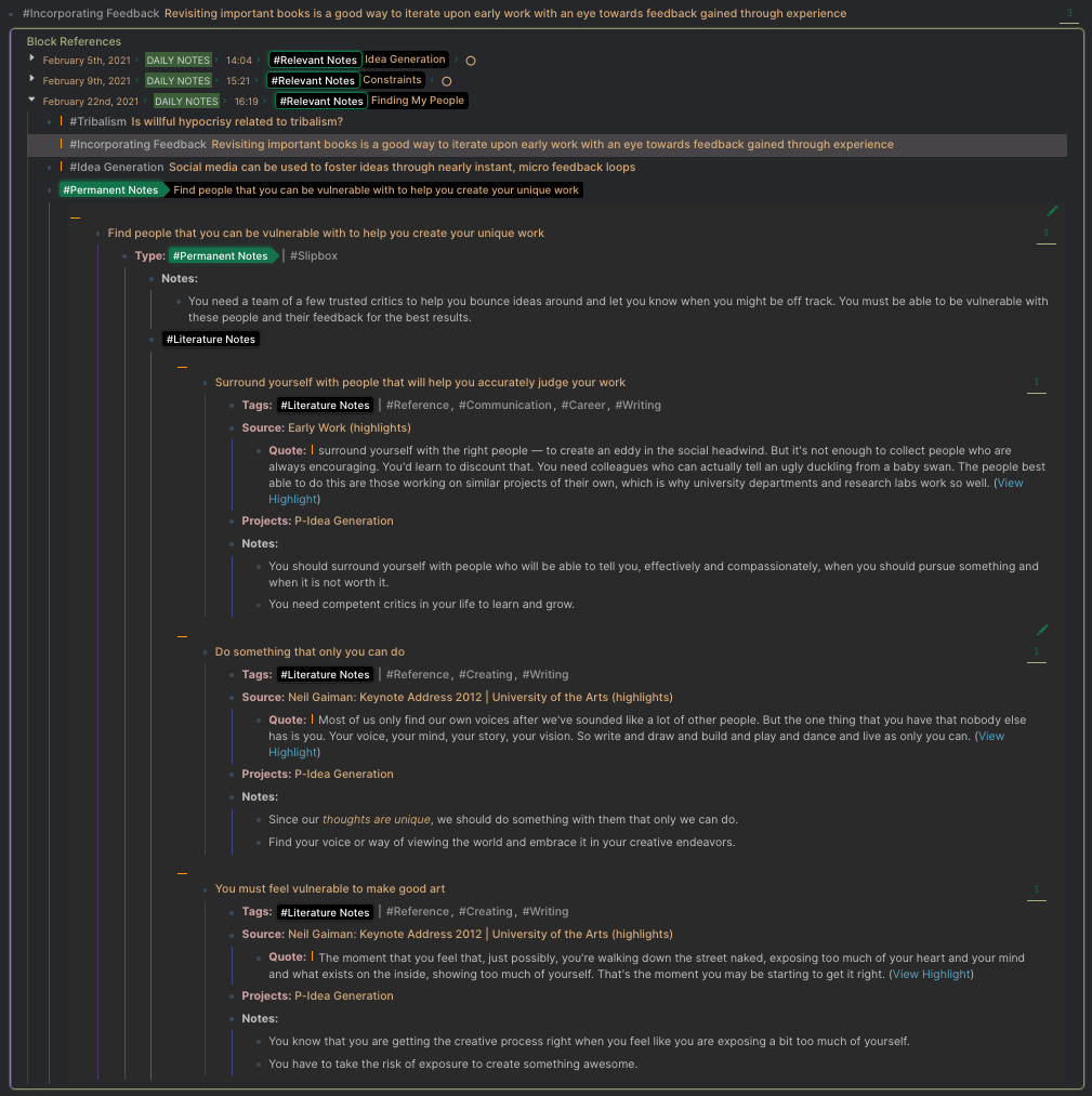 You have now constructed the literature notes from highlights, and permanent notes from literature notes block embeds. Finally, a block embed of the permanent note has allowed you to see the full context from the bottom up. When you are ready to write, you now have all of this rich content, in context, to pick and choose from.