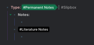 #[[Permanent Notes]] <page reference to permanent note here> - Finally, you will alt-drag the block reference to the permanent note title block to a location indented under the "Permanent Notes" block. Replace that block reference with a block embed so that everything under the permanent note (sources, literature notes, etc.) is visible.